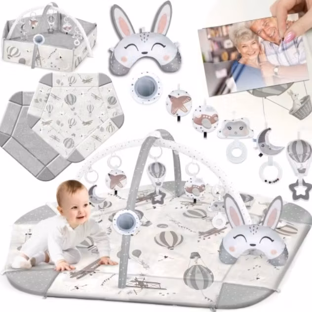 settet inkluderer: matte, 5 vegger, 2 buer, 7 multifunksjonelle leker, inkludert en GRATIS pute for å ligge på magen,