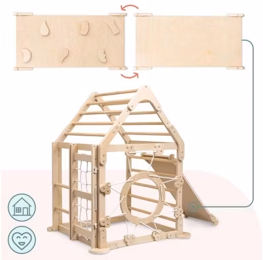 Gi barnet ditt en ekte lekeplass ... på sitt eget rom! Mamabrum klatrehus i tre kombinerer en klatrevegg, klatrevegg, nett, sirkulær åpning og et tak for klatring. Allsidigheten gjør det til et aktivitetssenter som oppmuntrer til bevegelse, utvikler fysisk form og gir timevis med moro.