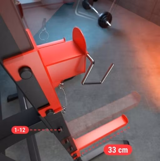 Stativet har regulerbare sikkerhetskroker. Hvis du ikke klarer å fullføre en repetisjon under pressøvelser, kan du enkelt og trygt slippe stangen på krokene. Den brede høydejusteringen gjør det mulig å tilpasse sikkerhetsnivået til hver øvelse.